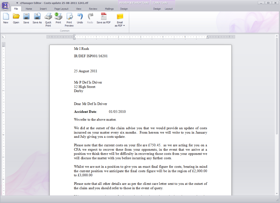 We'll provide you with a starter pack of letter templates. cManager's so flexible that you can easily integrate your existing precedent letters into it.